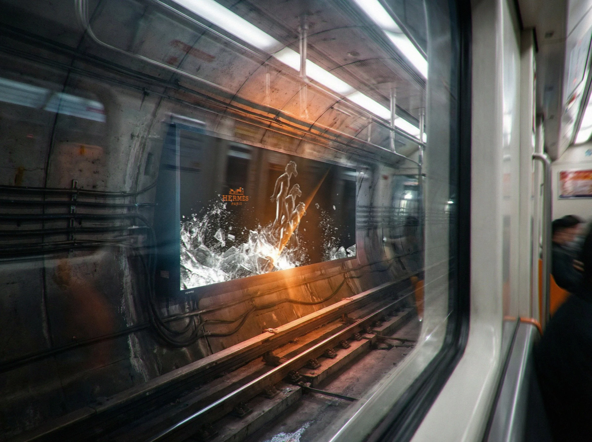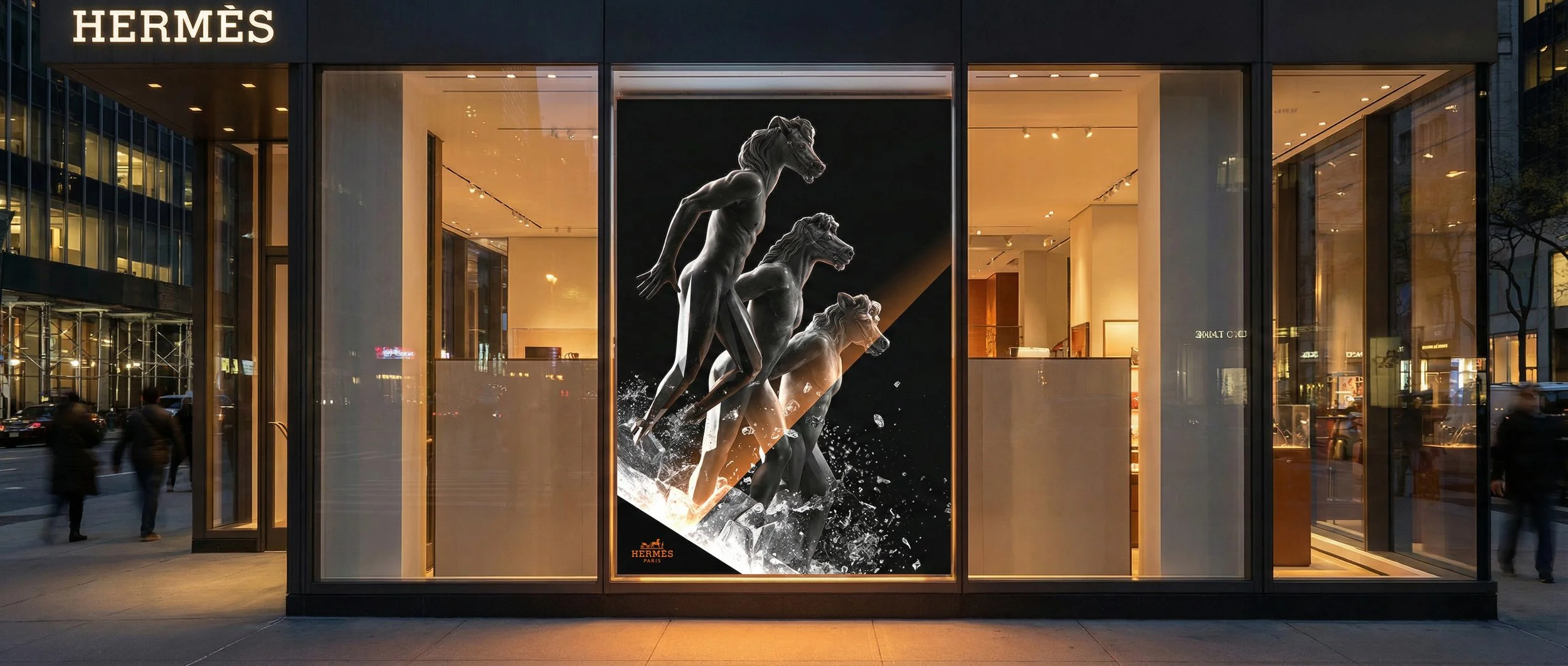 The final piece is a new take on Hermès’ famous carriage mark, shown as a cinematic scene. Three marble horse-headed figures rise through breaking ice, showing strength as service and elegance as power. The work blends classic sculpture with a surreal editorial style, using AI to add detail and movement.