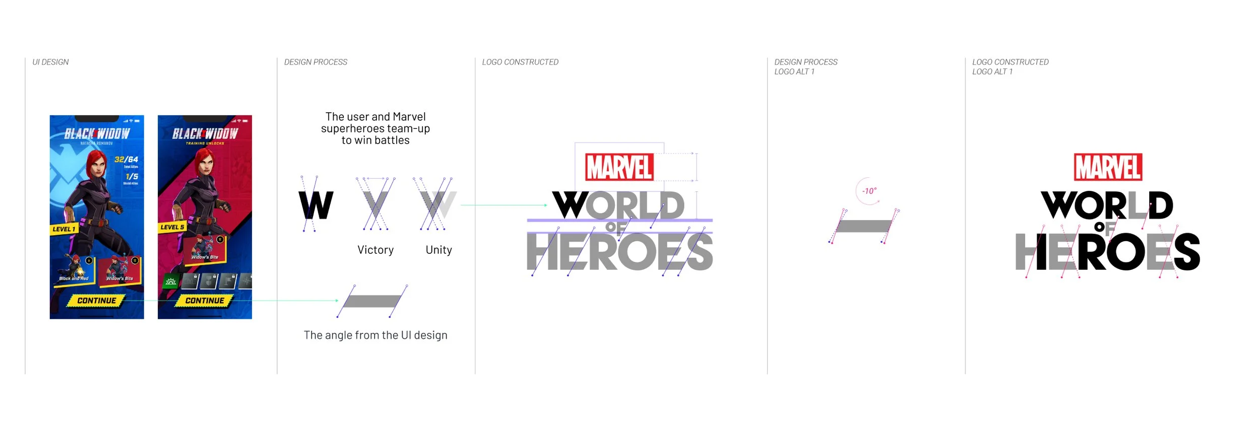 The Marvel World of Heroes logo is more than just a visual identifier—it embodies the essence of the game and the world it represents. Our goal was to create a logo that visually bridges the player's journey of becoming their own Marvel superhero in the real world. To achieve this, we infused elements from the game's UI, the concept of unity between players and superheroes, and the iconic portal system that allows users to traverse realms.