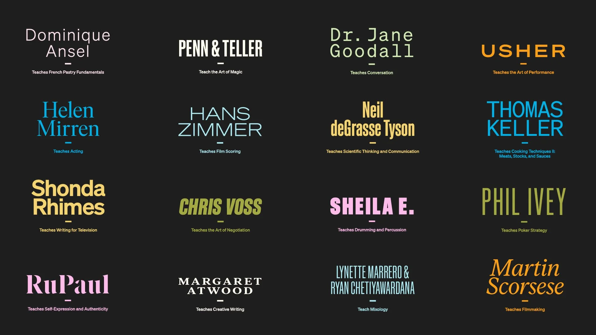 Each instructor on MasterClass now has a unique visual identity, including a distinct nameplate, font, and colorway that reflects their personal style. This approach highlights the diversity of instructors and enhances the user experience by creating a more personalized and engaging learning environment.